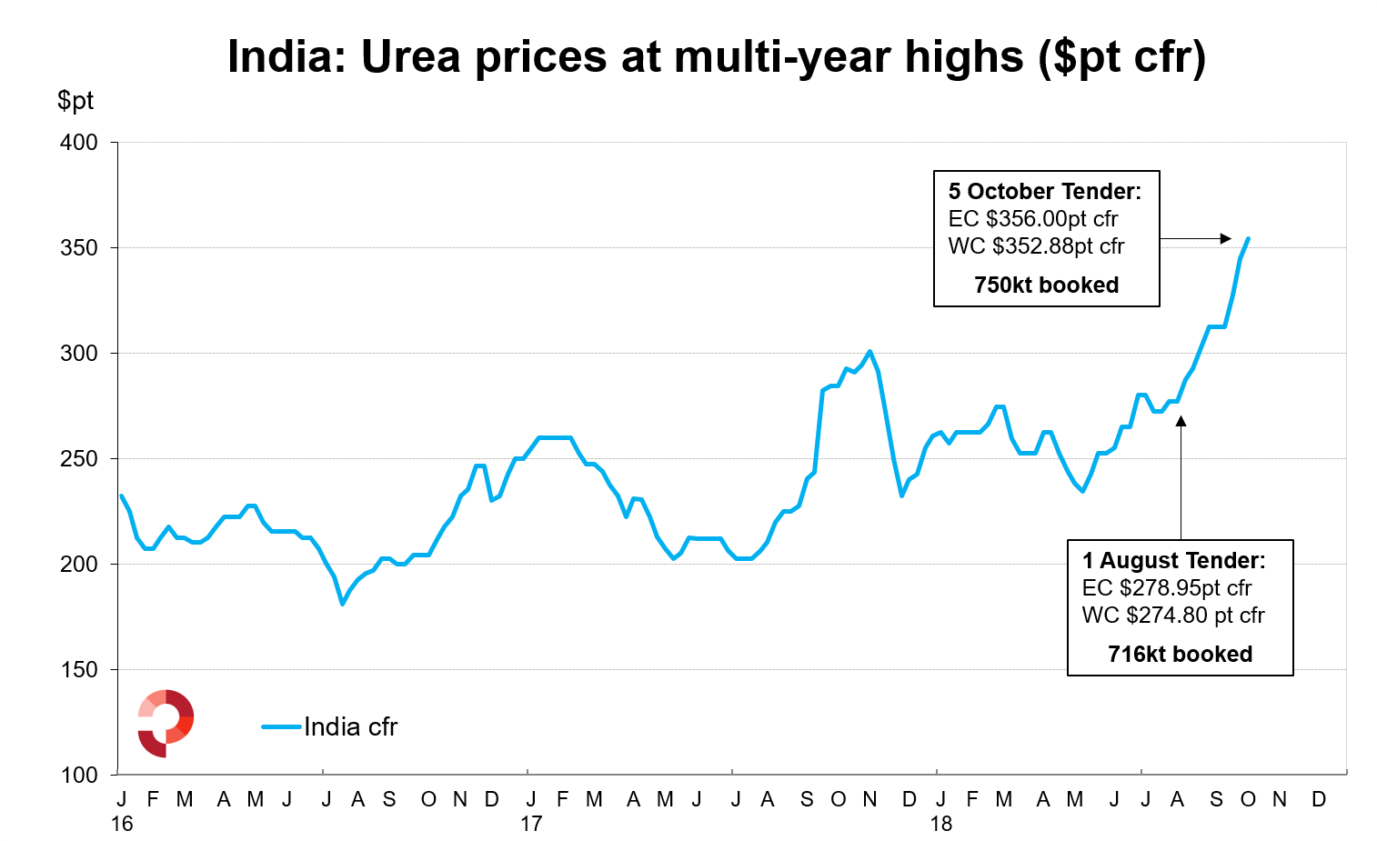 India moved quickly to issue LOIs and book 560,000t of urea in the few days immediately following the tender. Shortly thereafter, MMTC (the tendering agency), was able to secure an additional 190,000t, bringing the total awarded to 750,000t.