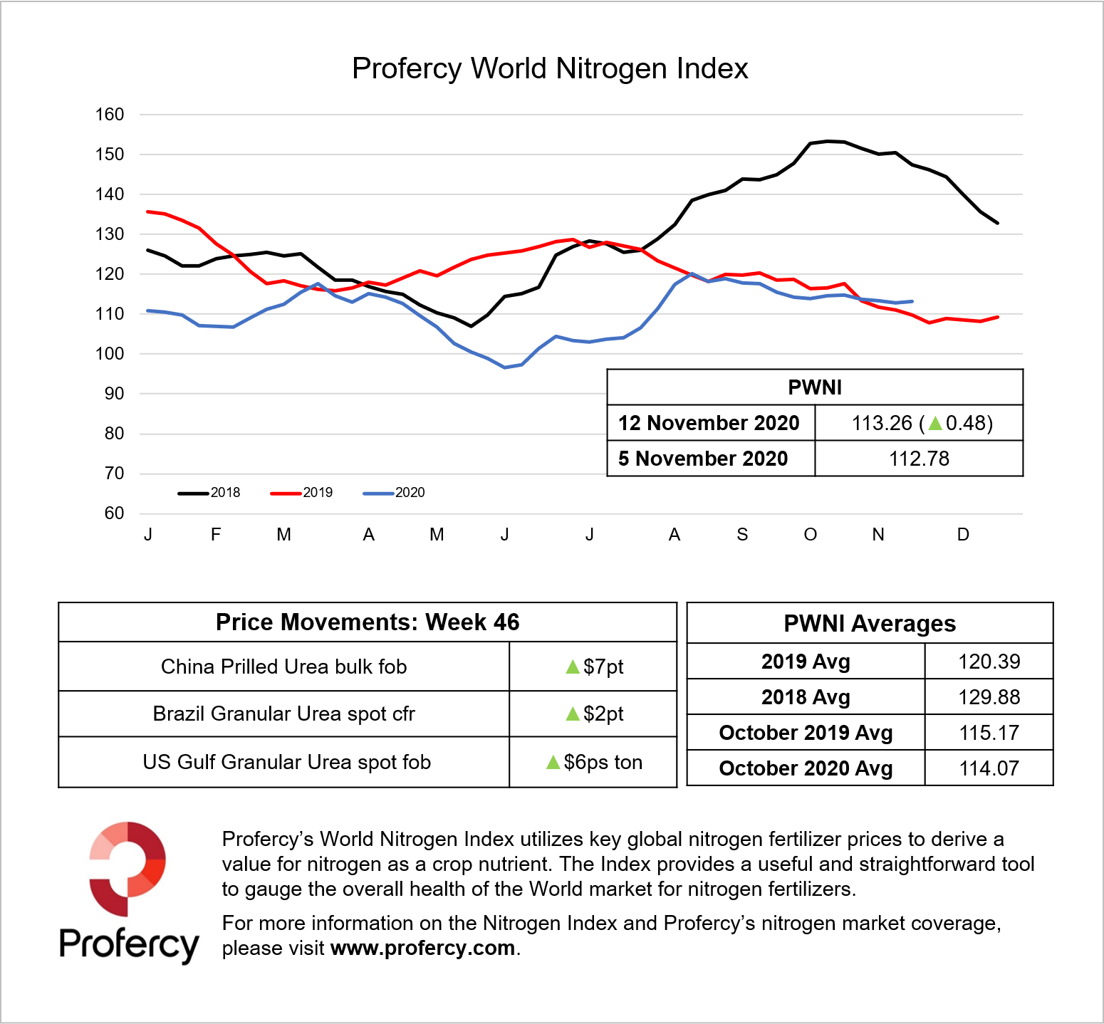 Profercy’s World Nitrogen Index edged 0.48 points higher to 113.26 this week.