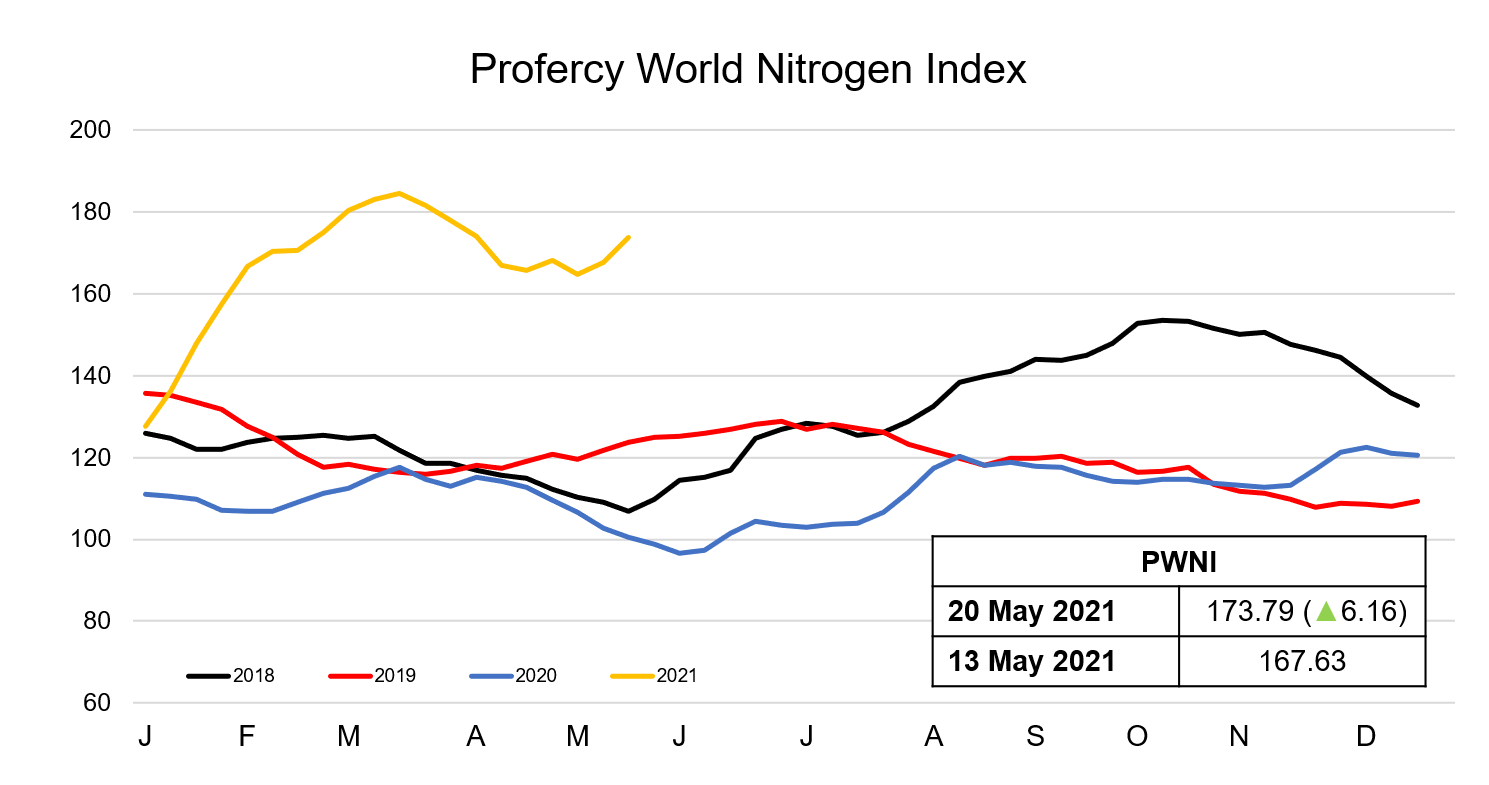 The Profercy World Nitrogen Index gained by 6.16 points week on week to 173.79.