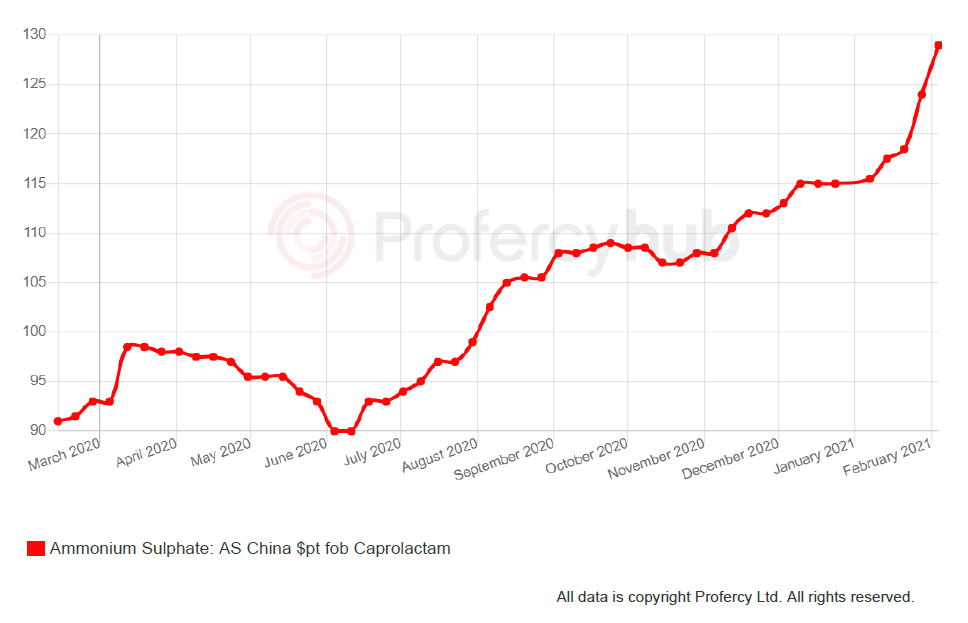 Increasing urea values since mid-December last year have exacerbated the situation, but Chinese capro amsul prices have been steadily rising since mid-June 2020. In mid-June, capro amsul prices were around $90pt fob China.