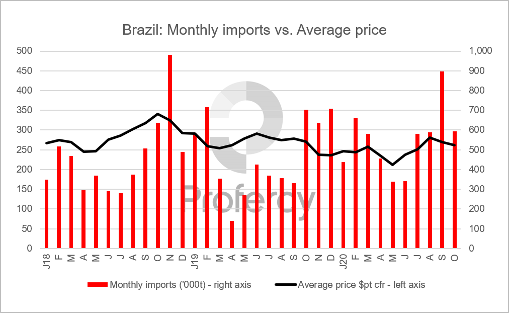 Latest customs statistics show that the Latin American country has imported 2.66m. tonnes between July and October this year, up from 1.76m. tonnes during the same period in 2019. Indeed, Brazil only needs to import a further 443,000t in November and December to match the total imports seen during the second half of last year.