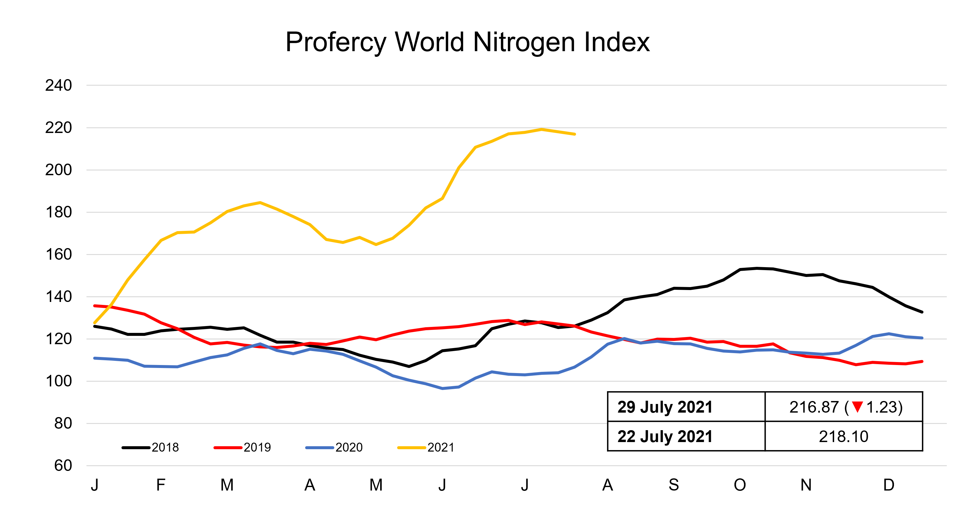 The Profercy World Nitrogen Index dropped 1.23 points this week to 216.87.