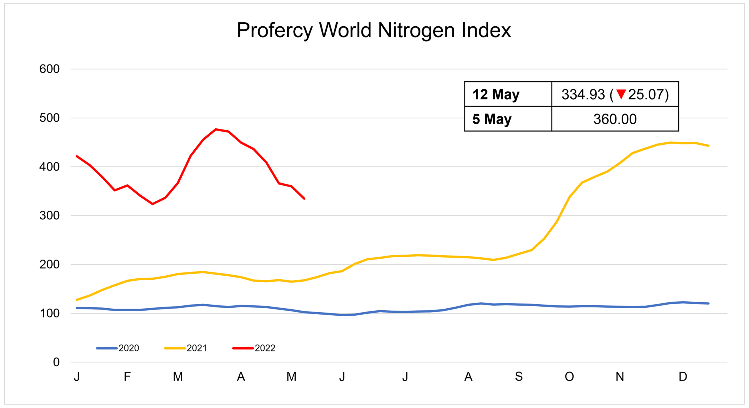 The Profercy World Nitrogen Index declined by 25.07 points week on week to 334.93 this week. The sharp decline is largely due to the major readjustment in Baltic AN values.