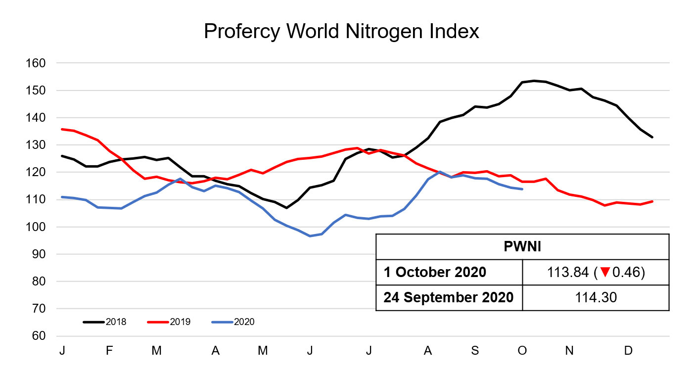 In spite of this, the reaction to the news in the urea market was not overwhelmingly bullish, and the Profercy World Nitrogen Index tracked sideways to 113.84 points, down 0.46 from last week. This said, moderate price gains have been seen in the derivatives market in the past 24 hours with November Arab Gulf contracts trading at $260pt fob.
