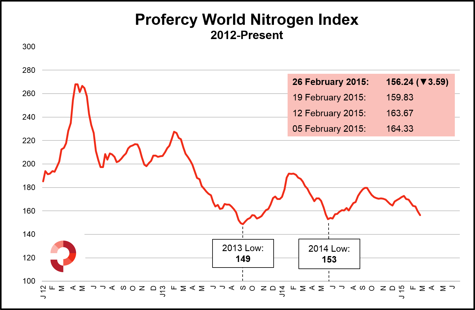 Profercy’s World Nitrogen Index has lost over 10 points since the beginning of February and stands at 156.24. At this level nitrogen values, as represented by the Index, are within three index points of the low seen in 2014 and 7 index points from the 2013 low.