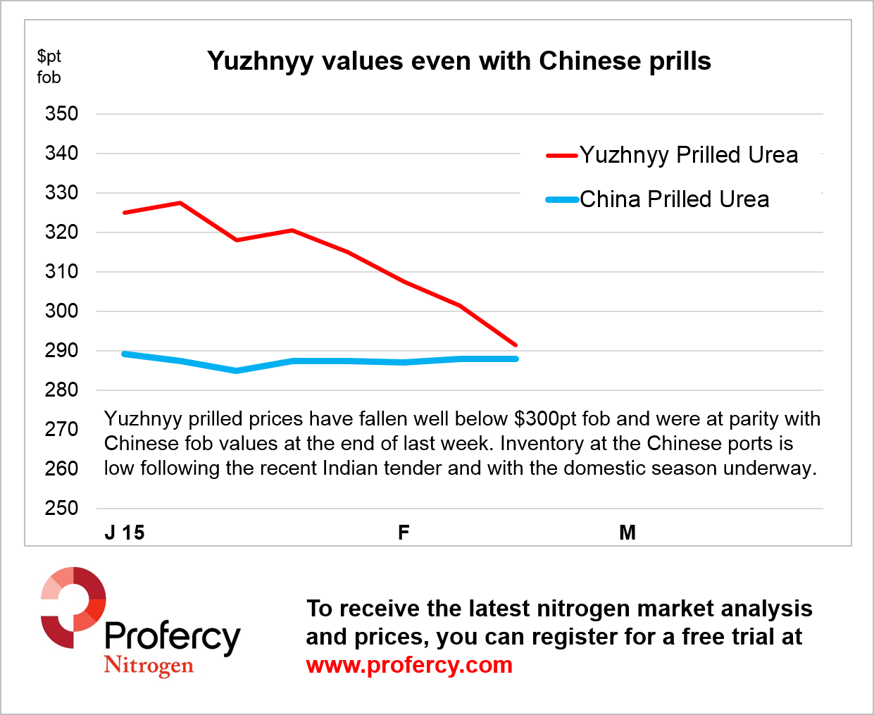Yuzhnyy prilled prices have fallen well below $300pt fob and were at parity with Chinese fob values at the end of last week. Inventory at the Chinese ports is low following the recent Indian tender and with the domestic season underway. [Prices basis Profercy Nitrogen Reports January to 19 February 2015] [/tab][tab title="This week's Profercy Nitrogen Report"]