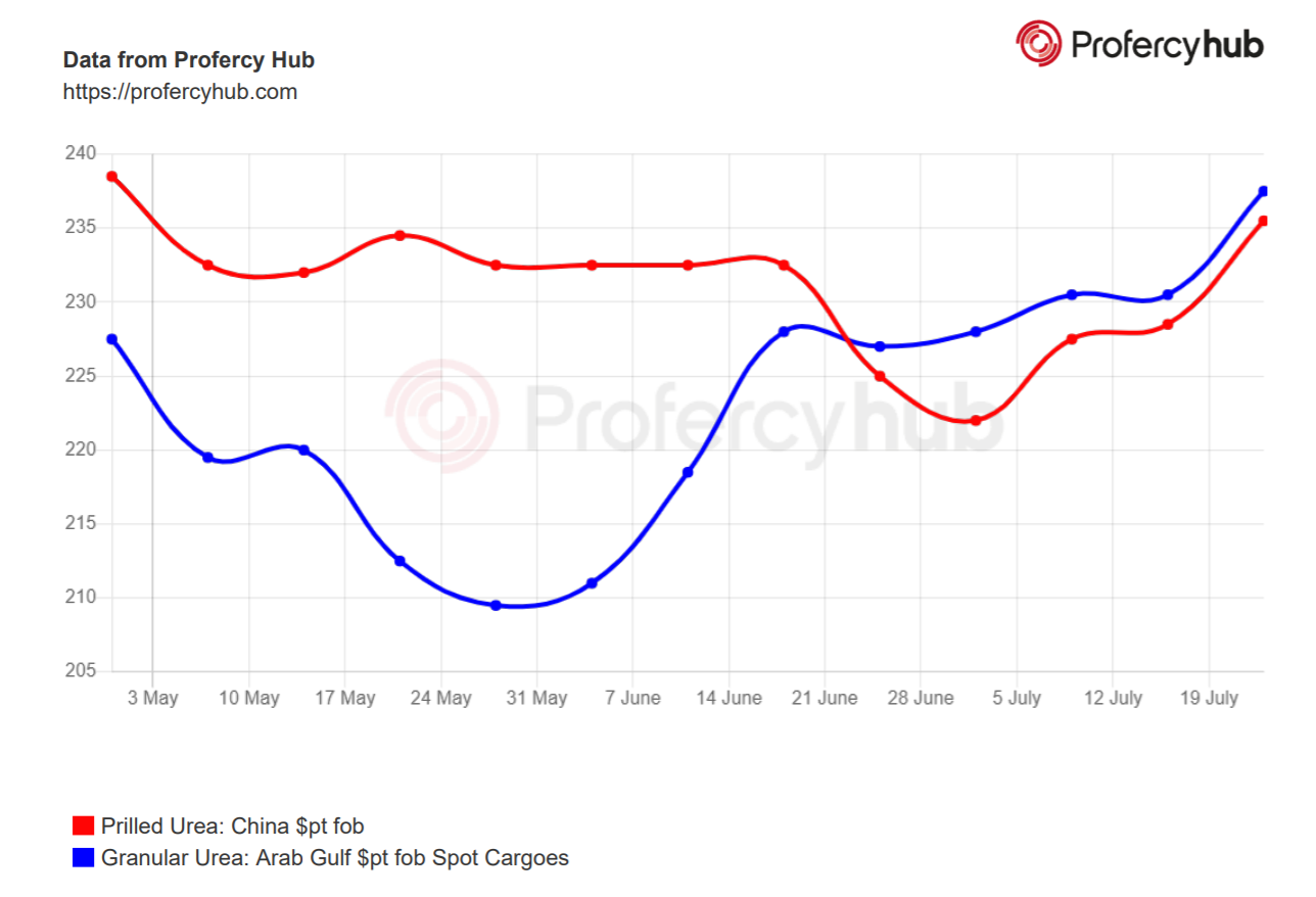 While in North Africa, Egyptian granular urea values hit the $250pt fob mark this week with 40,000t sold via a sales tender for August movement. Producer offer levels were $10pt lower just last week.
