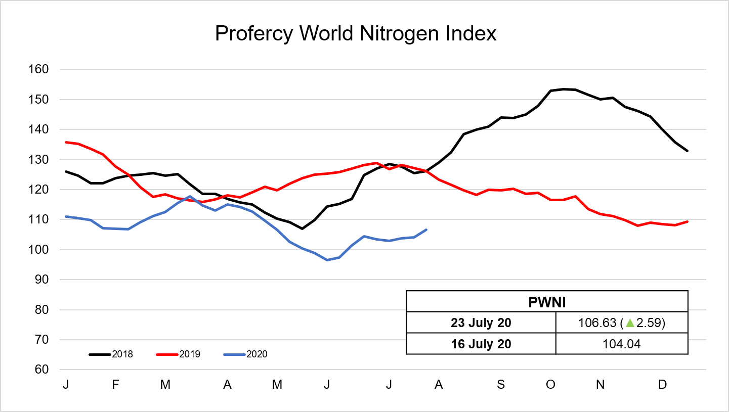 The Profercy World Nitrogen Index has increased by 2.59 points to 106.63 this week, buoyed by strong price gains in the urea market.