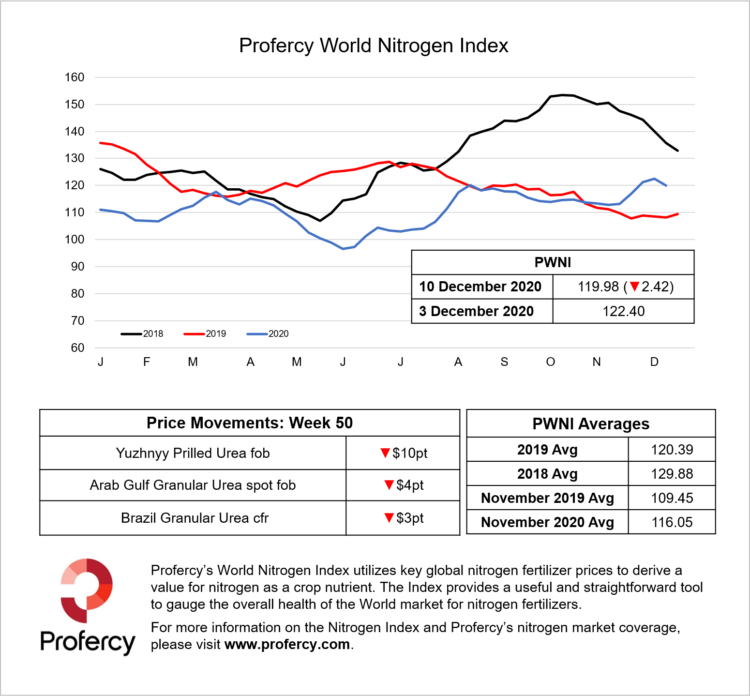 Following four weeks of advances where the Profercy World Nitrogen Index increased by nearly 10 points, the index has this week fallen by 2.42 points to 119.98, with urea values declining in the west and Middle East.