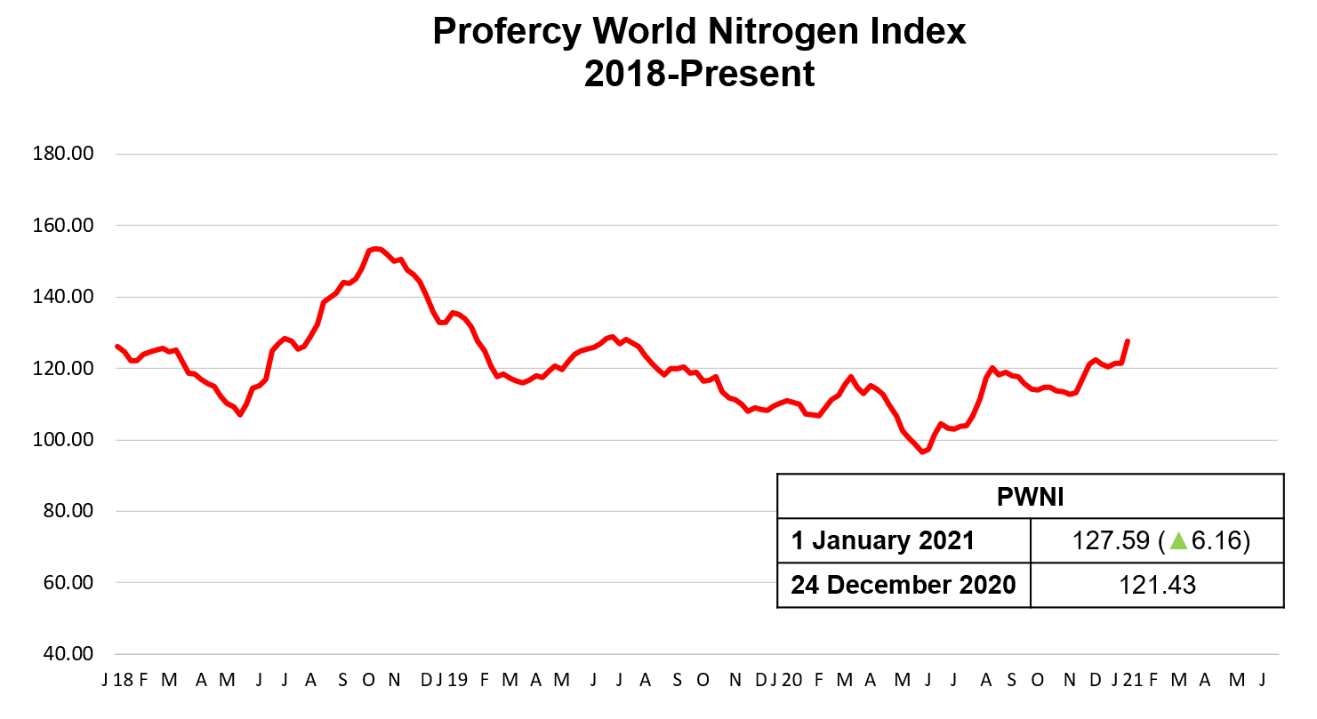 Profercy World Nitrogen Index makes rapid ascent as US urea prices increase 14% in a week, while values elsewhere make similar gains