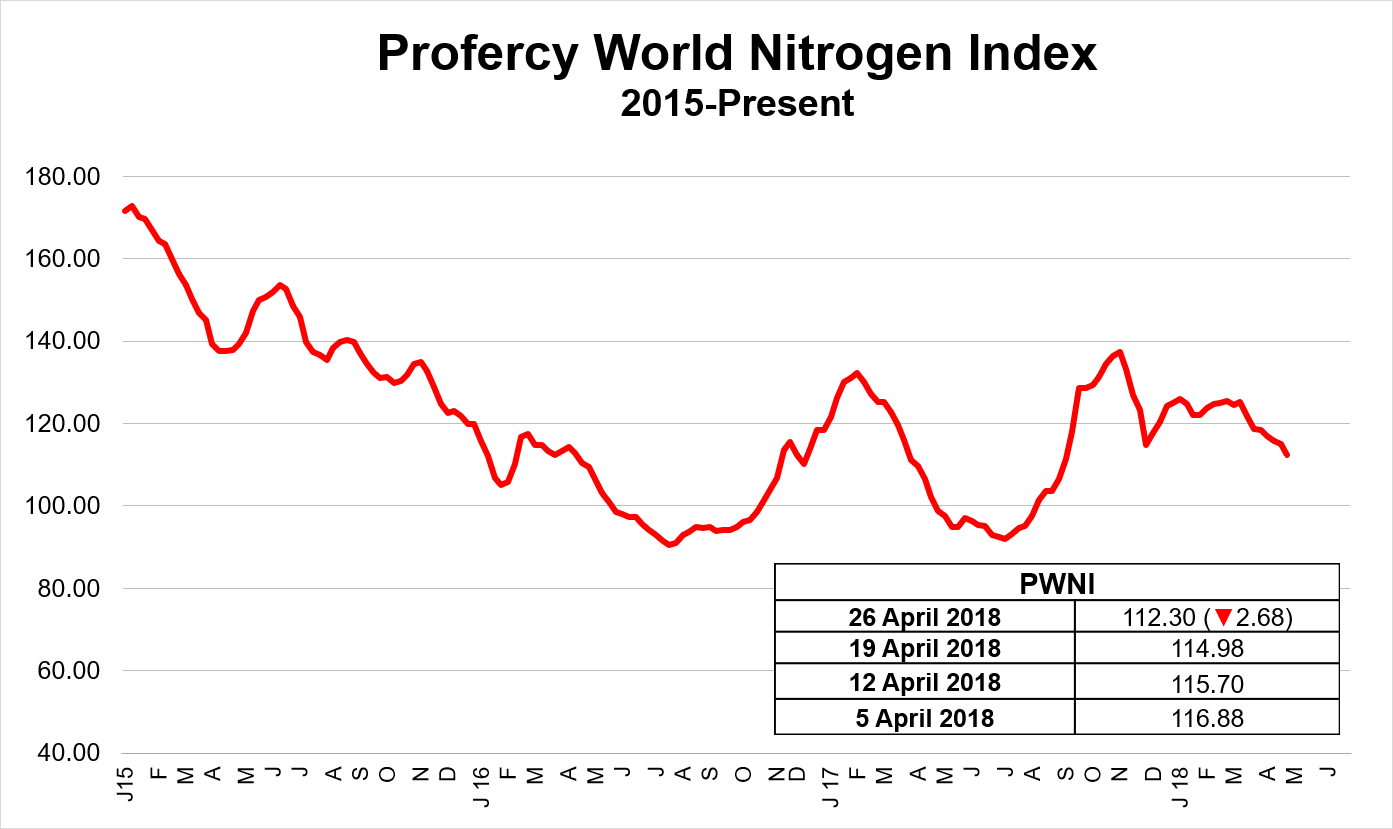 The Profercy World Nitrogen Index hit a low last seen at the beginning of September 2017 but remained comfortably above levels seen this time last year.