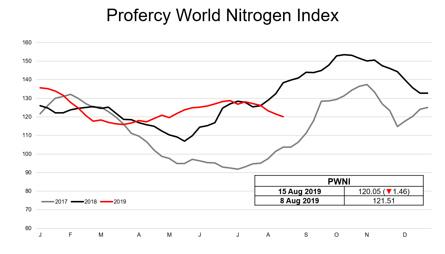 Nitrogen values have declined for five consecutive weeks with the Profercy World Nitrogen Index down a combined 8.01 points over the period to 120.05 points, 18-19 points lower year on year.