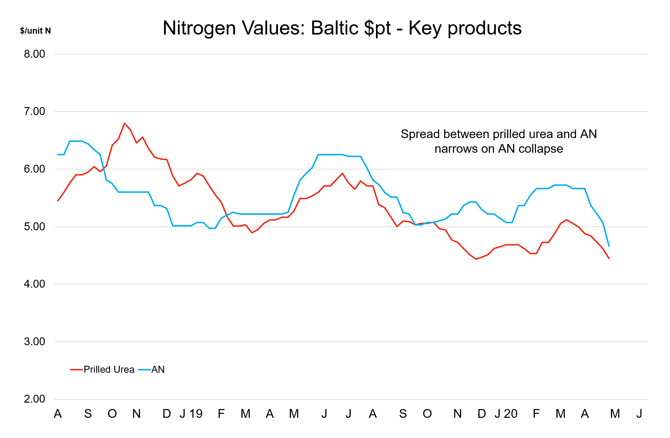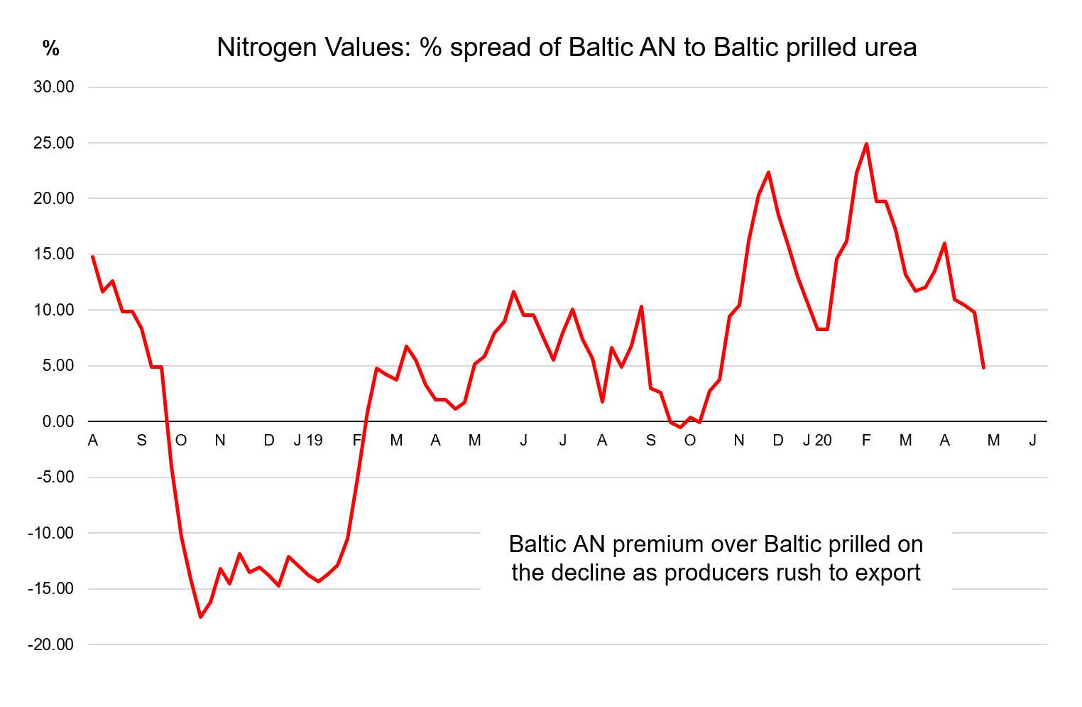Not only did the outright price collapse to $155-160pt fob but AN’s premium over urea halved to 5%. At the start of April Baltic AN prices were above $190pt fob.