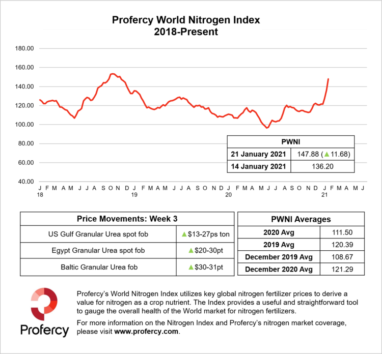 With nitrogen markets firm, the Profercy World Nitrogen Index is up by more than 11 points, surpassing last week's record increase.