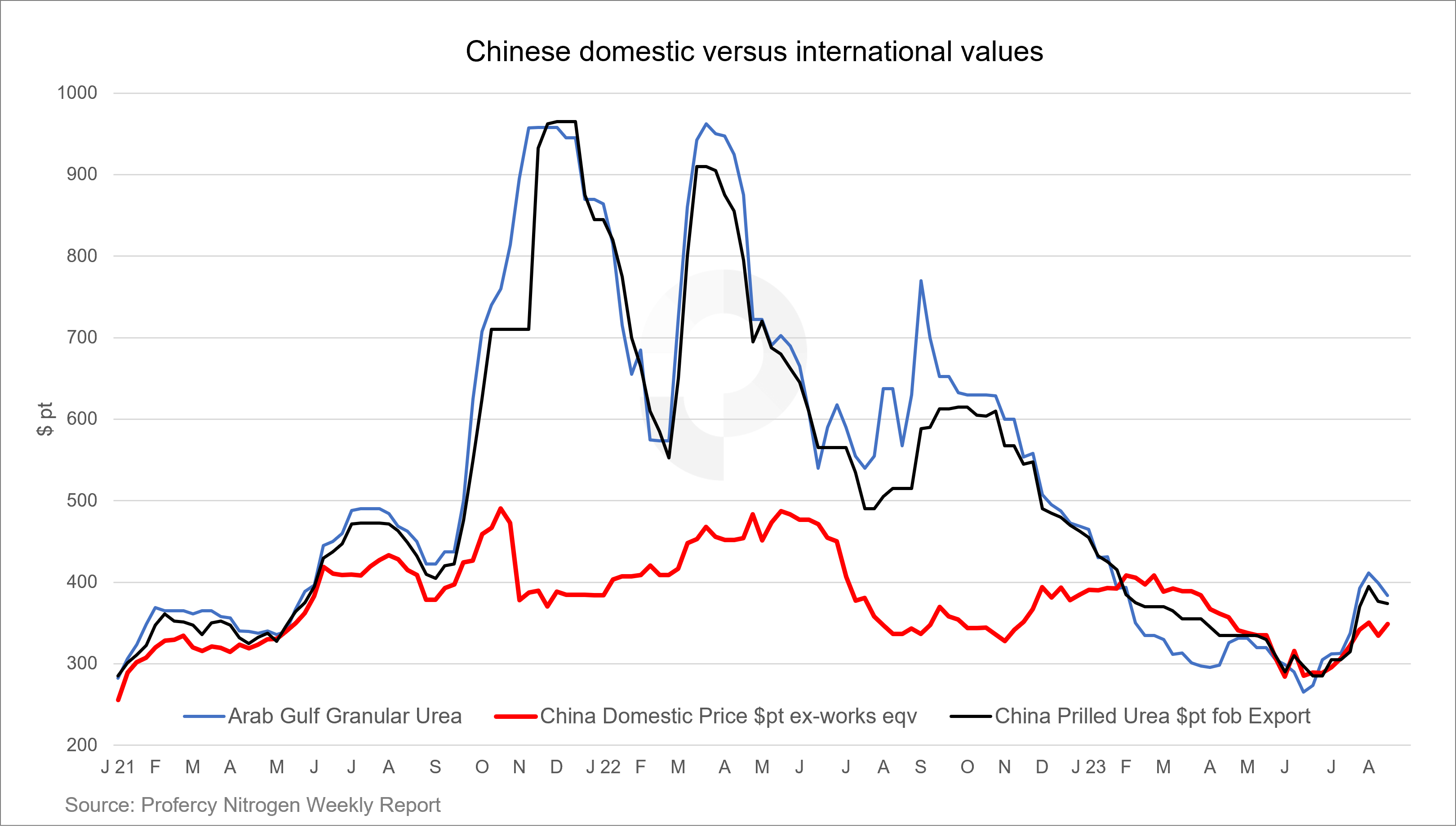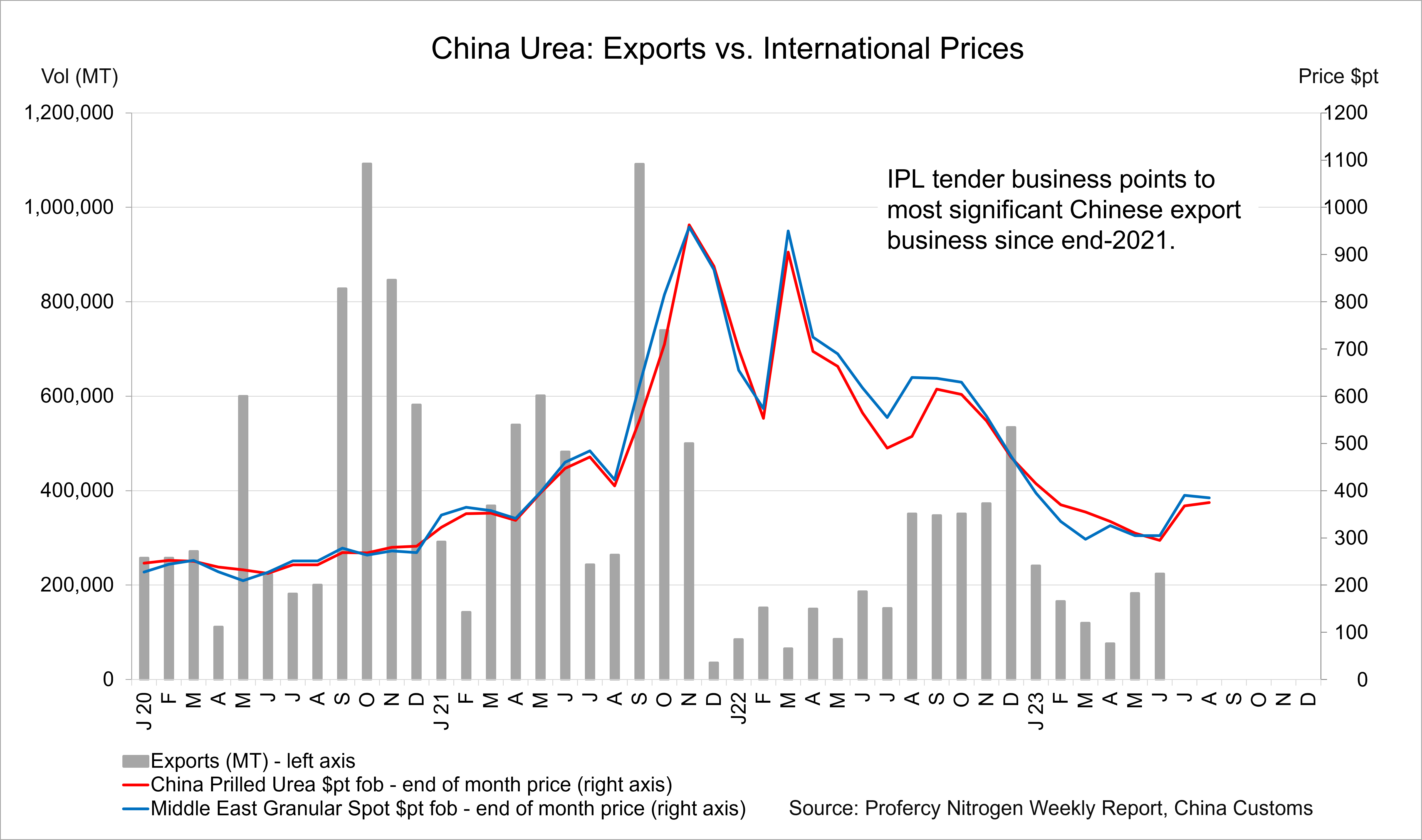 As much as 1.1m. tonnes of urea has been committed to India from China for shipment by 26 September, signaling the most significant export business since September 2021, when over 1m. tonnes were exported in a single month.