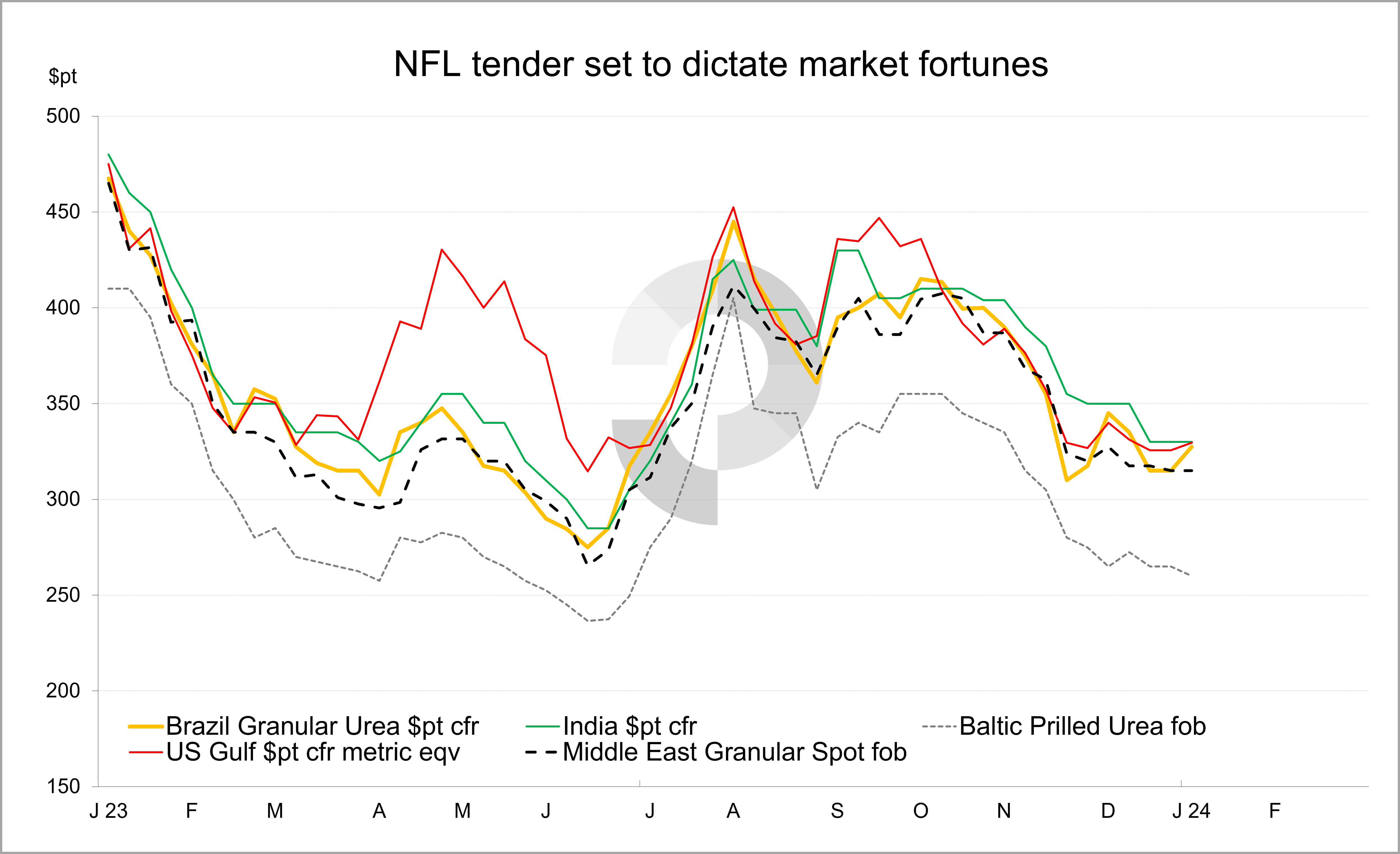 National Fertilizers Limited (NFL) closed a tender 4 January for shipments to 29 February. Business elsewhere has largely been on hold ahead of the conclusion of the tender. Indeed, both price levels and the eventual volume booked will shape market discussions around January into February shipments. This comes as peak-season import demand is due to surface in both the USA and Europe.