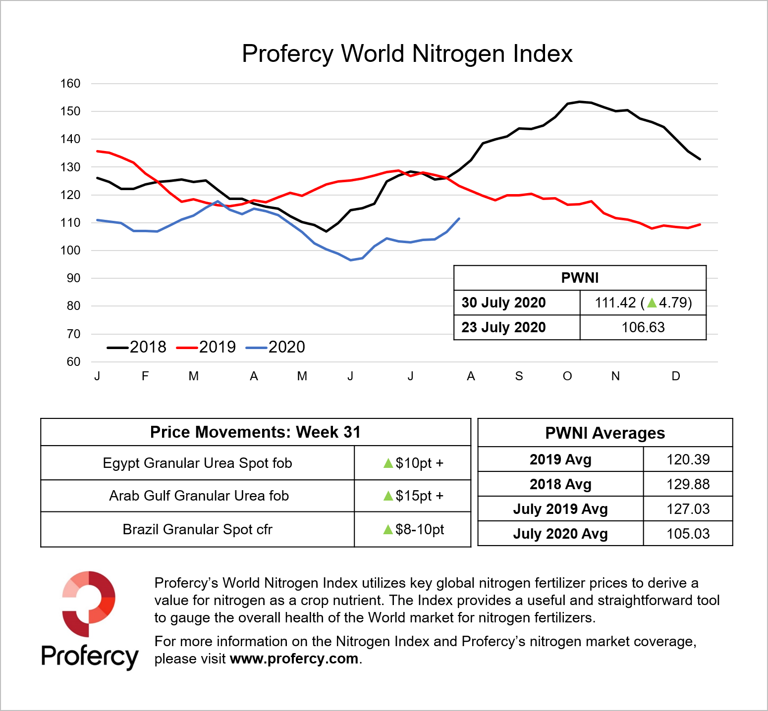 With the India-China dynamic putting suppliers in the driving set, the urea market is firm. Profercy’s World Nitrogen Index advanced by over 4.7 points this week, the biggest single increase since October 2018. Price gains for ammonium nitrate, ammonium sulphate and to a lesser degree global UAN values also supported the Index.