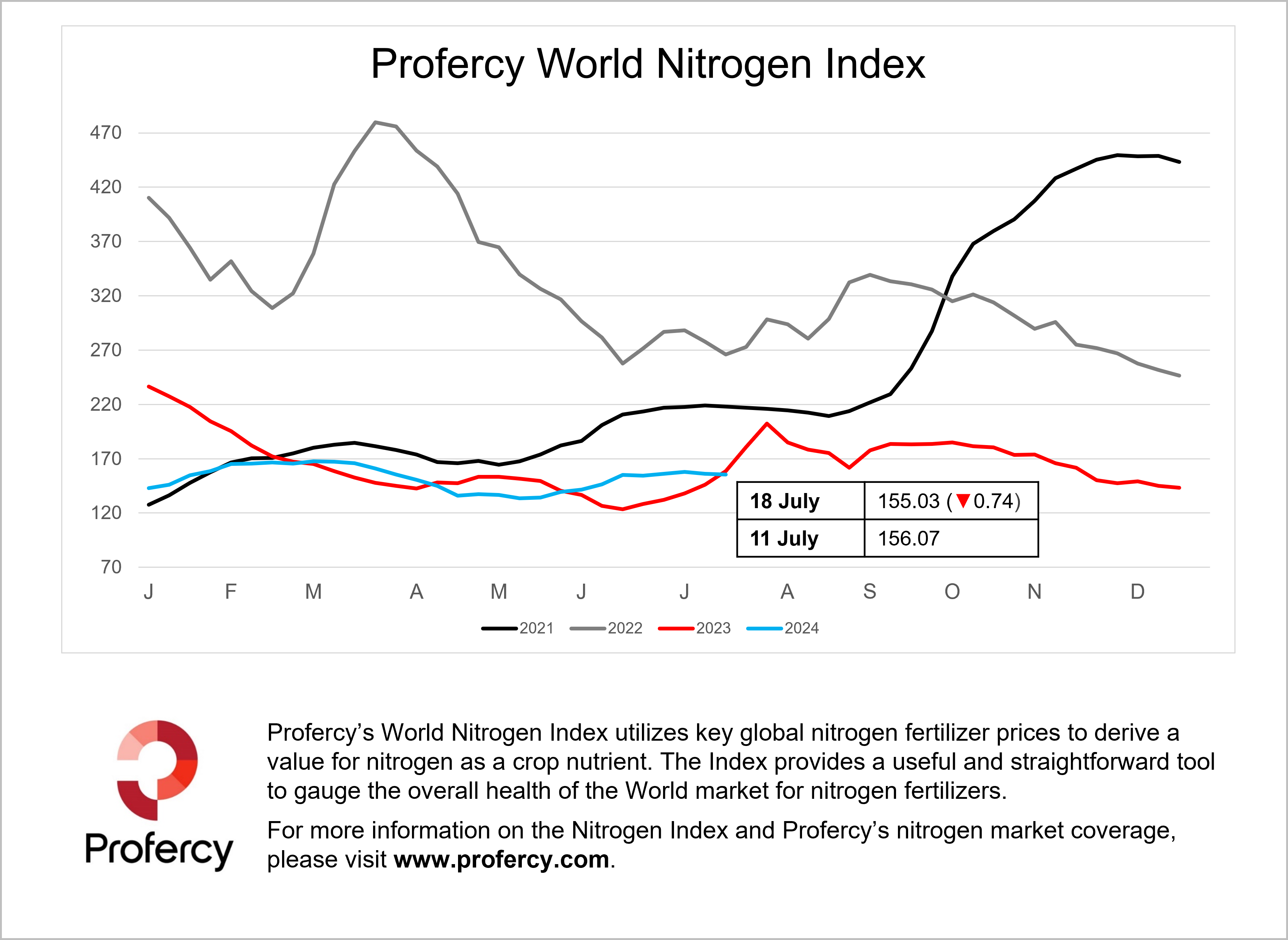 As demonstrated below, global values have been rangebound for a while. Profercy's World Nitrogen Index registered a modest decline this week and stands at 155.03. The Index has been either side of 155 since mid-June.