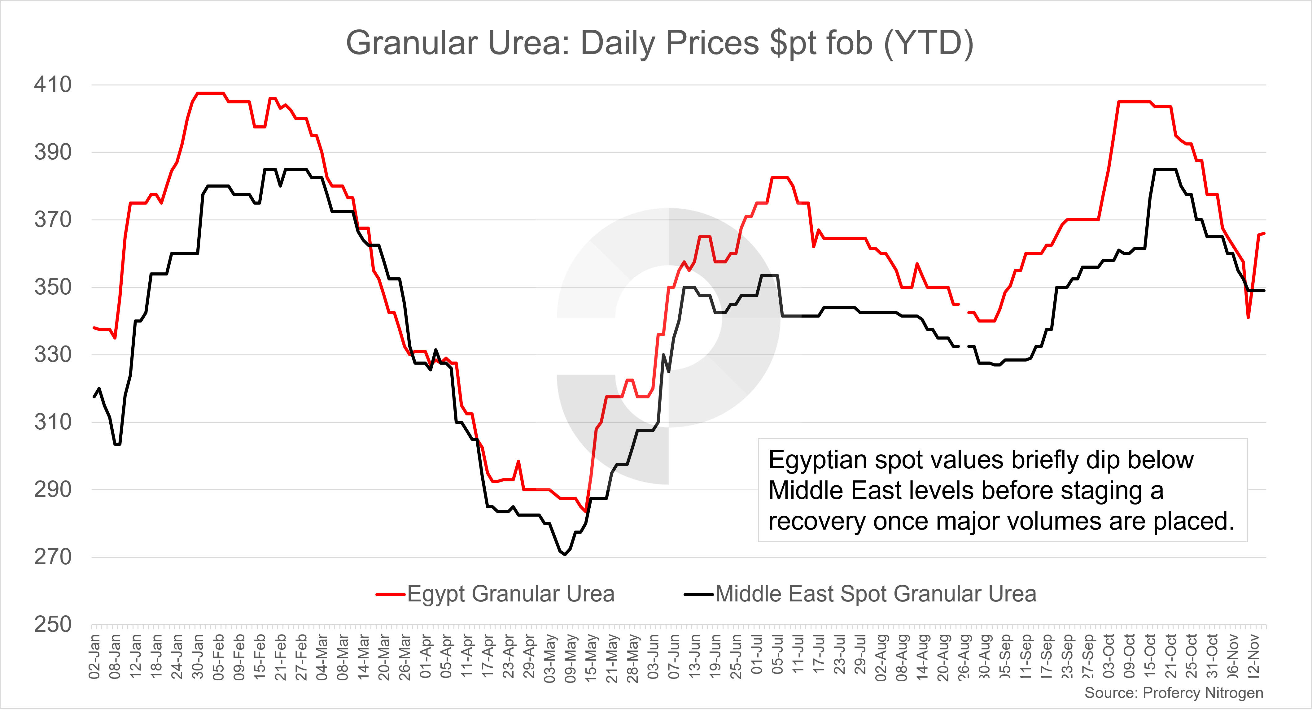 At least 60,000t of granular urea was sold either side of $340pt fob, a figure $20pt below earlier producer price ideas and $67pt below the October peak.