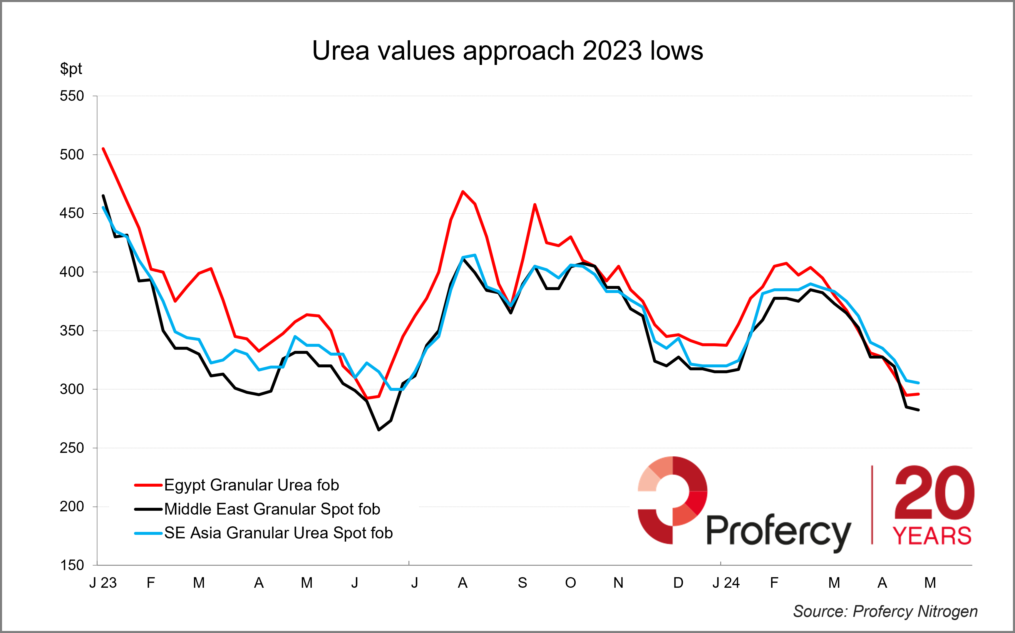 Global urea prices have been moving lower since they peaked in the second half of February. Middle East granular urea spot values were assessed by Profercy around $385pt fob just two months ago. Basis offer levels last week for May shipments, latest values are below $285pt fob.