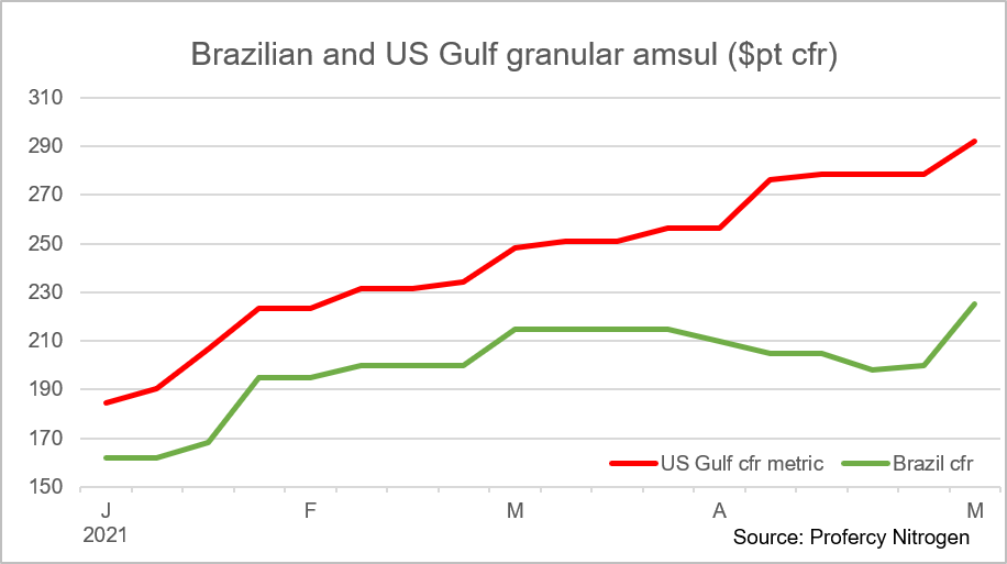 Since the start of this year, US Gulf granular amsul values have rallied around $100ps ton and currently stand at a high $270ps ton fob Nola ($292pt cfr metric). Over that period the price has not once reversed any of the previous gains with current prices some $90ps ton above those in Q2 2020. While amsul values have been firm for much of 2021 elsewhere, no other market has seen uninterrupted price gains. Indeed, after a firm start the Brazilian compacted/granular market mirrored that of granular urea and stalled in late March and into April. Granular amsul values reversed gains with prices dropping from $215pt cfr to just below $200pt cfr from late March to late April.